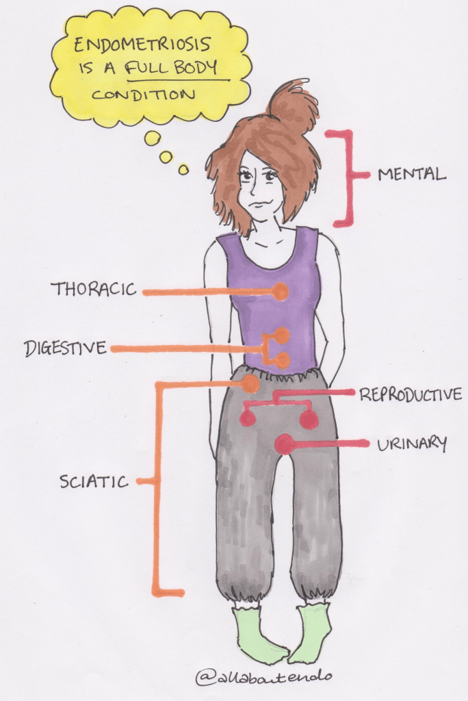 Endometriosis is mistakenly – and unfortunately often – referred to as a purely gynaecological condition, or ‘just a bad period’. This is far from true. Endometriosis is an inflammatory and systemic condition, meaning that its effects can be felt throughout the entire body. Side effects can encompass urinary and reproductive complications, sciatic and nerve issues, thoracic and digestive problems, as well as mental side effects such as brain fog and depression. This is something that I wish had been emphasised further when I was first diagnosed, as being informed on the possible side effects of a chronic condition is vital to finding suitable care pathways.